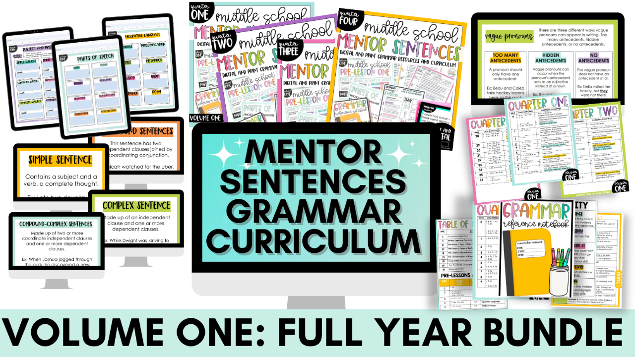 Teach grammar by creating an authentic learning experience with this complete 36-week print and digital bundle of middle school mentor sentences and grammar activities. This bundle includes 36 weeks of done-for-you digital and print mentor-sentence grammar curriculum: teacher lesson plans and slide decks, examples and possible answers, interactive notebook lessons with examples and quick note versions, and self-grading weekly assessments.