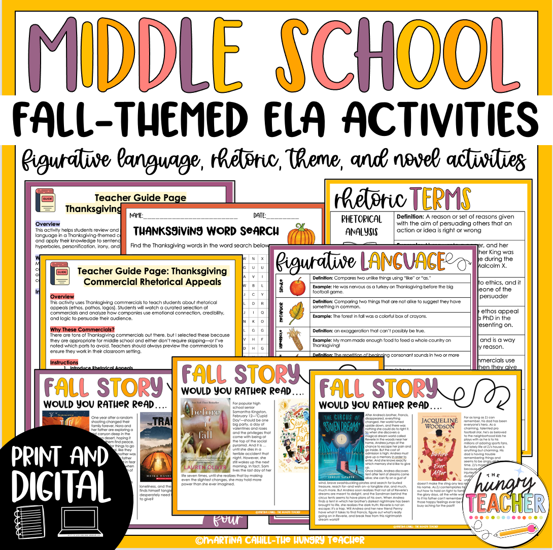 This Fall Themed ELA Activities Unit gives your students engaging, skill-focused practice in figurative language, rhetorical appeals, theme, and independent reading—all wrapped in fun, seasonal activities that keep them motivated during the fall months. From Thanksgiving commercials and autumn-inspired songs to novel choice activities, students practice critical thinking and analysis while connecting with media and texts they enjoy.